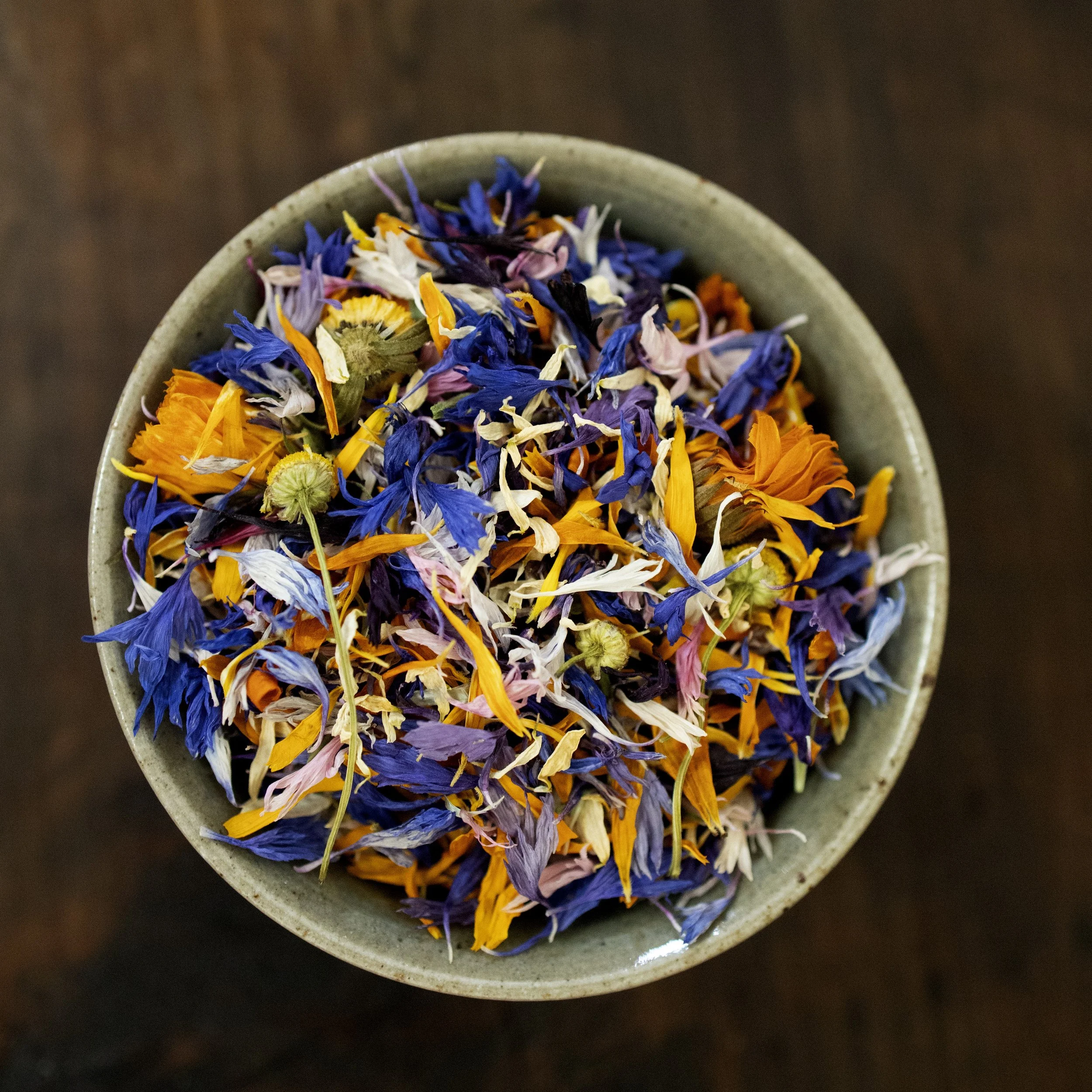 100% Natural, Real Edible Flowers grown in the Hudson Valley, NY. A sophisticated mix of Calendula, Chamomile and Bachelor Button Flowers. Hand harvested and delicately dried in complete darkness for maximum preservation of color and aroma. Use as a garnish for cakes, cocktails and desserts; this blend will add deep natural colors and visual depth. You can also use it for decorating cheese and charcuterie boards as well as chocolates, candles, baked goods, paper-crafts, wedding invitations and more!